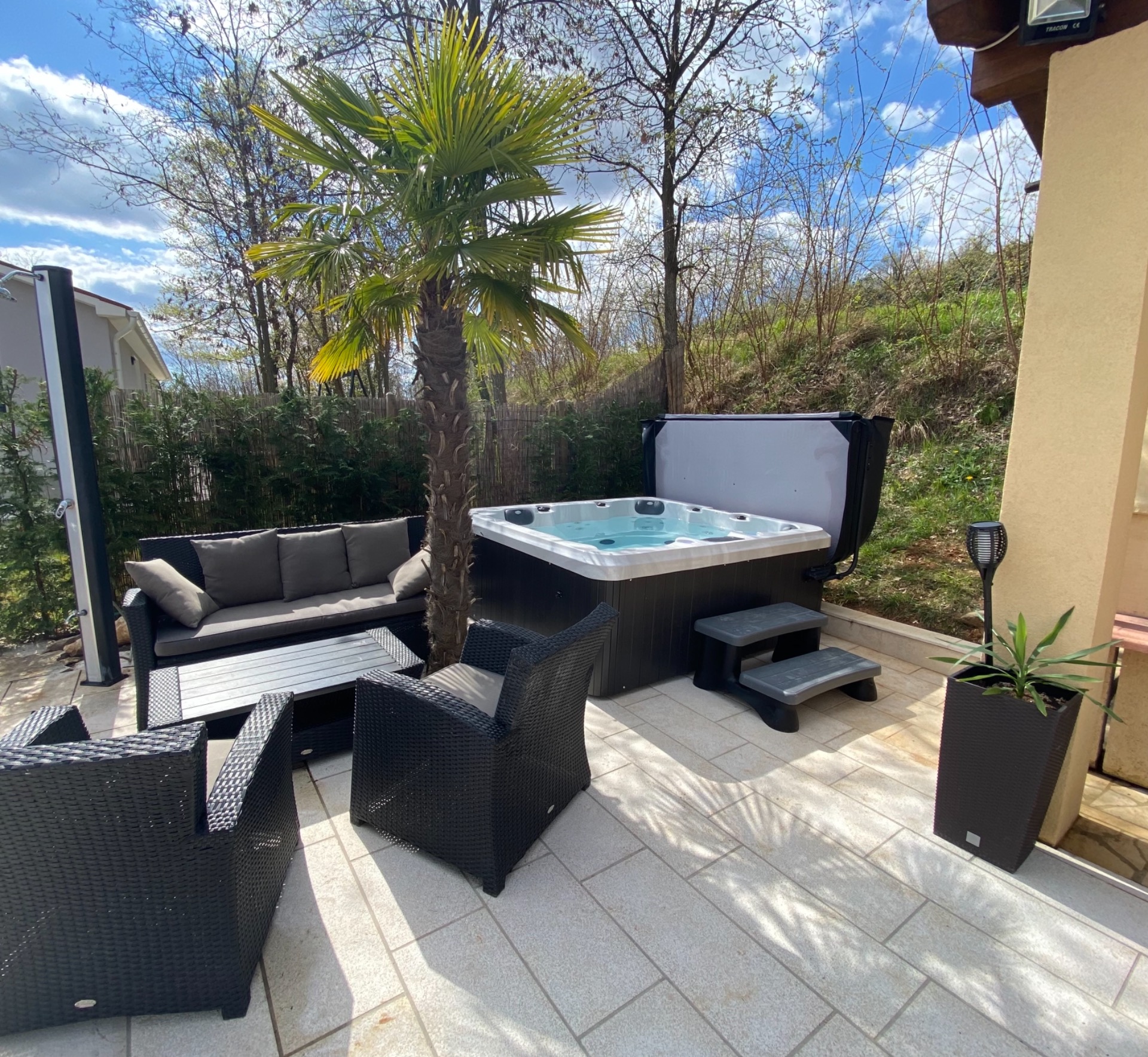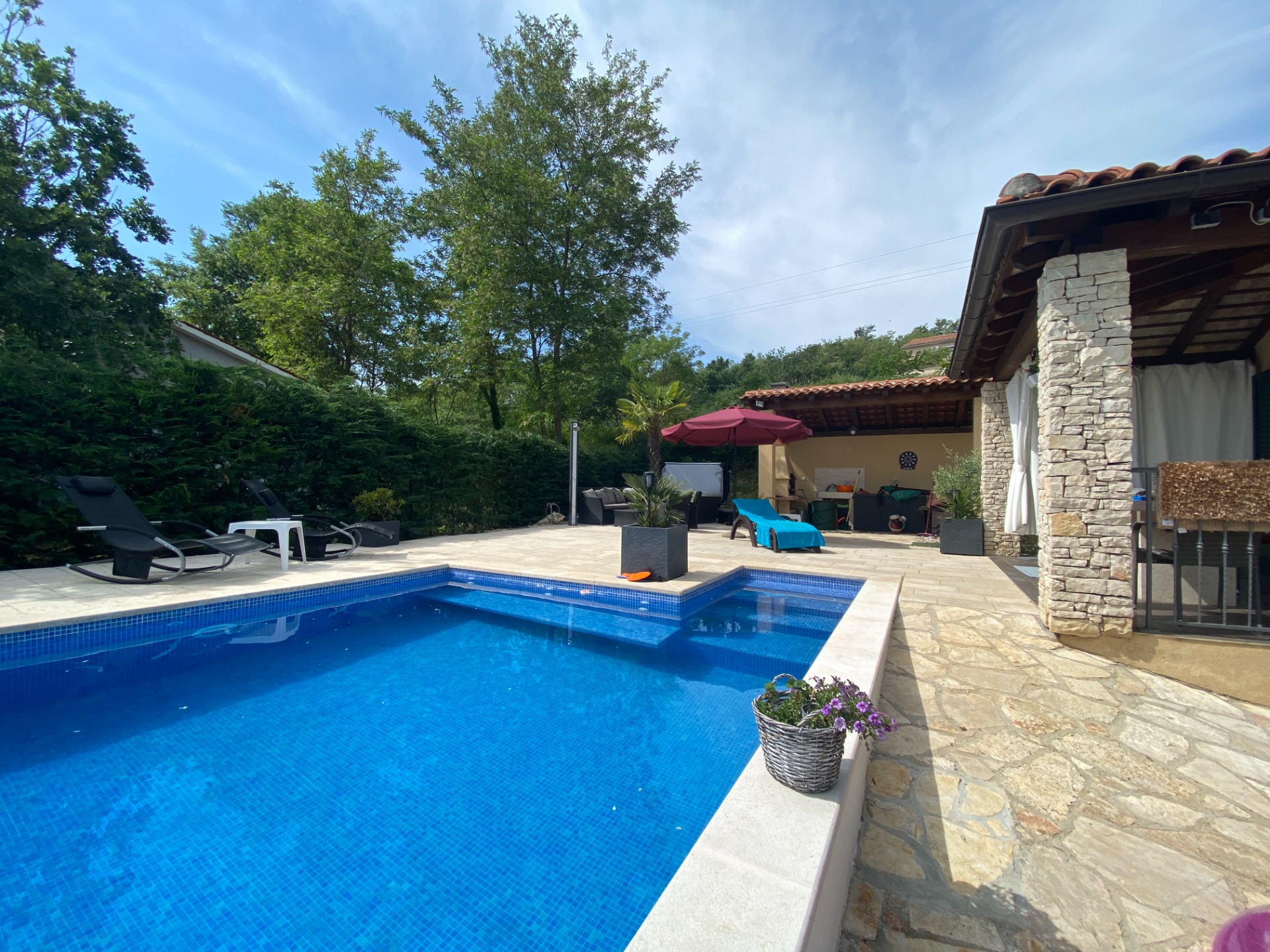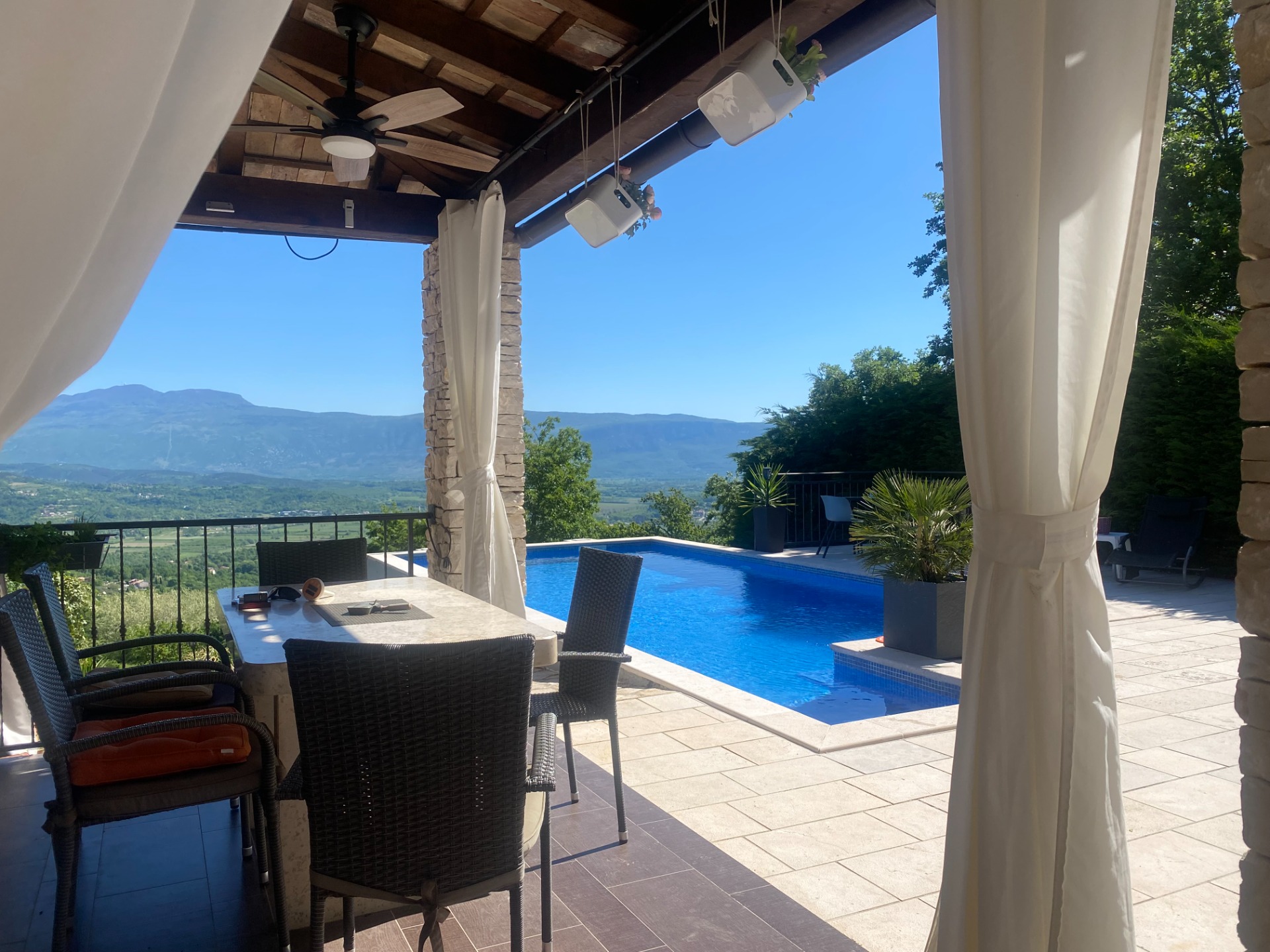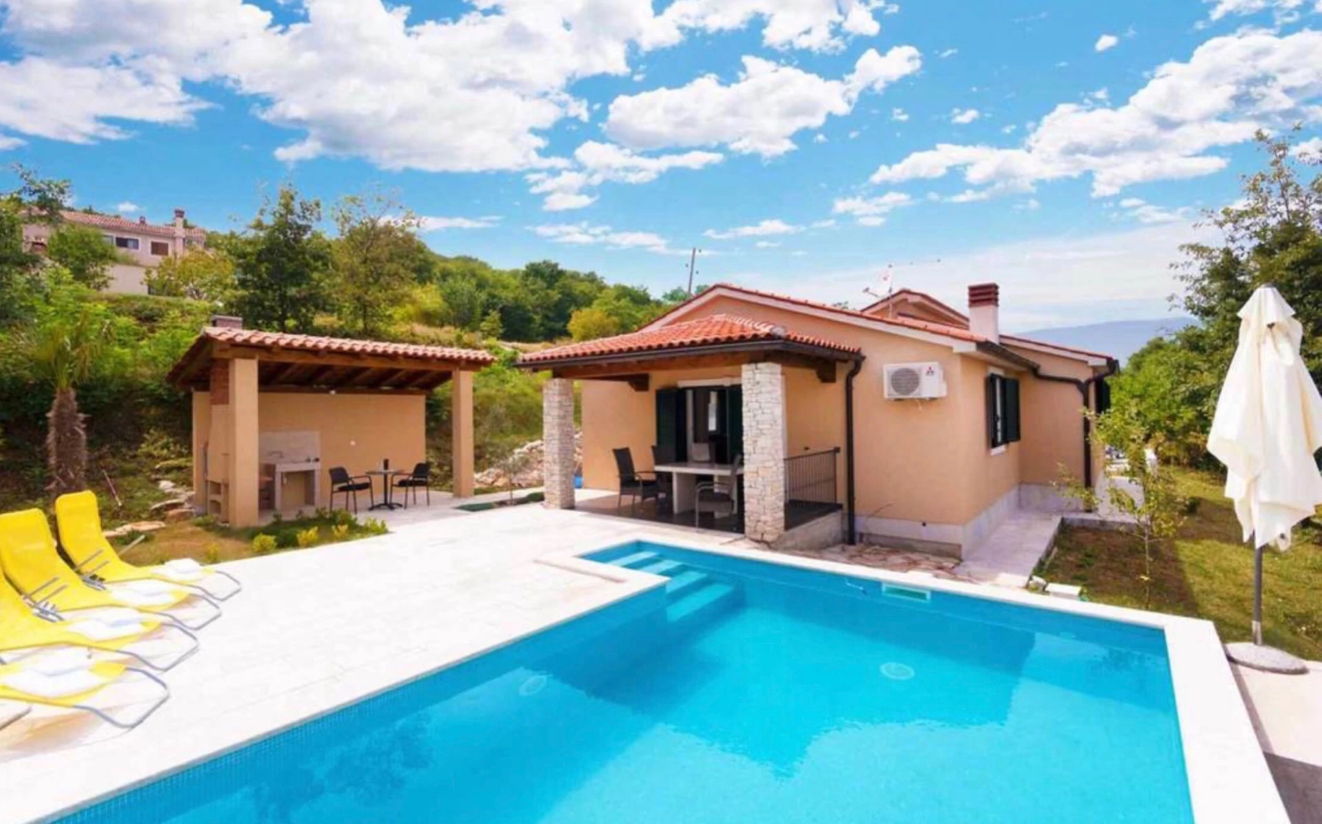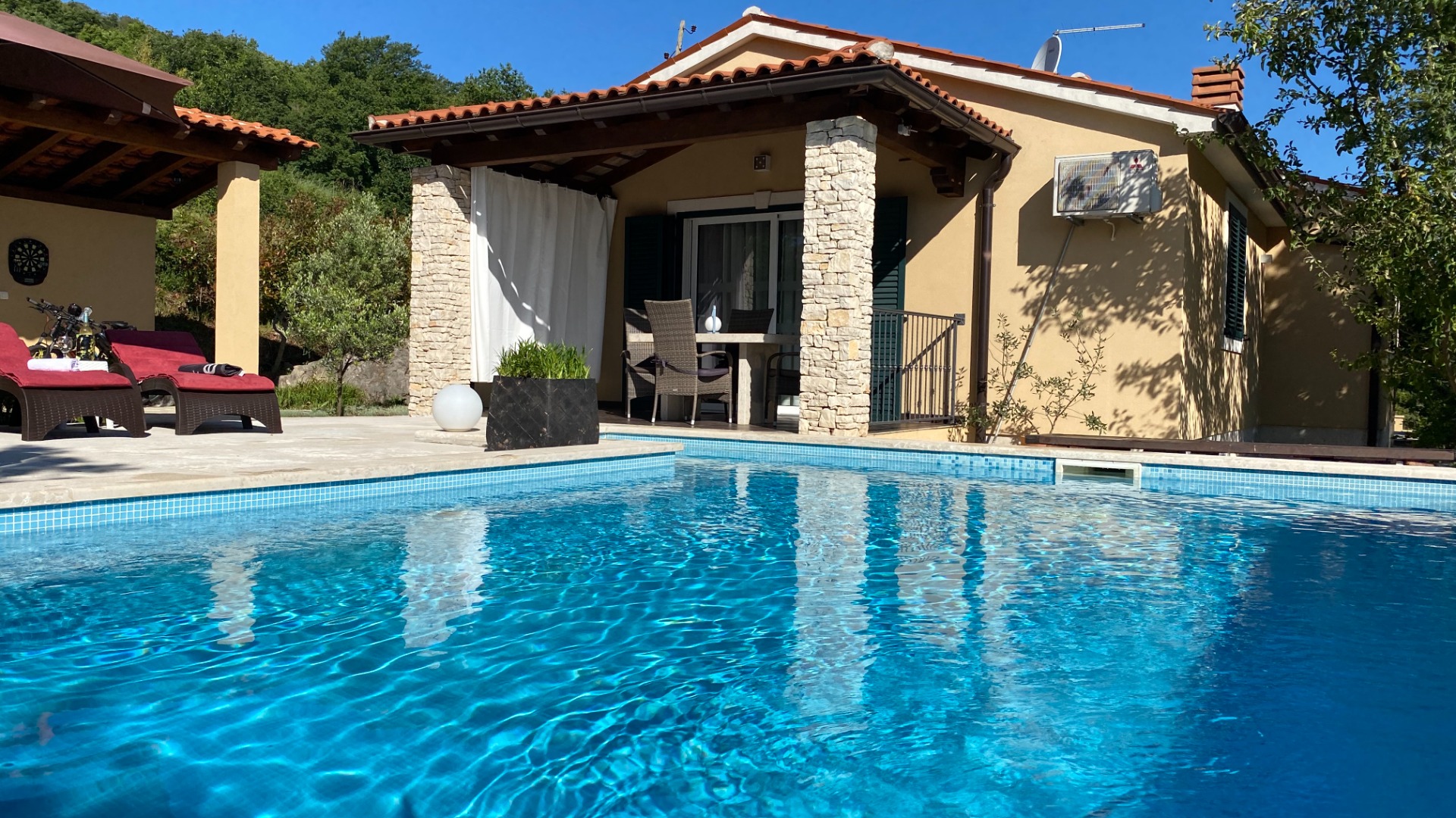 in wunderschöner Hanglage mit atemberaubenden Ausblick, sie genießen absolute Privatsphäre in dieser alleinstehenden Villa mit eingezäuntem privatem Garten. Ideal für Urlaub mit Hund.